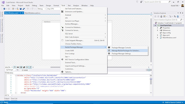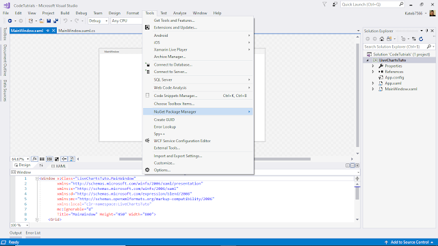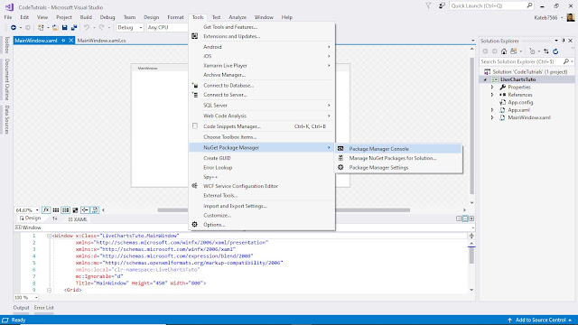 First of all steps we want to see how to use the package manager :1 – We open Visual Studio on the project to which we want to add Live Charts, go to tools -> NuGet Package Manager on the menu bar: