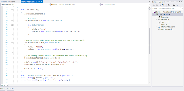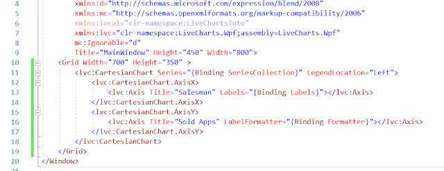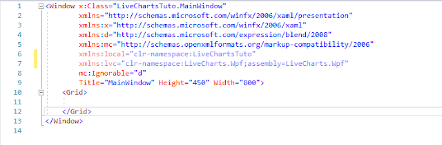 Well, the last thing we should do to have our application capable of using Live Charts, we need to add some lines of code :A namespace to your XAML :xmlns:lvc=”clr-namespace:LiveCharts.Wpf;assembly=LiveCharts.Wpf”