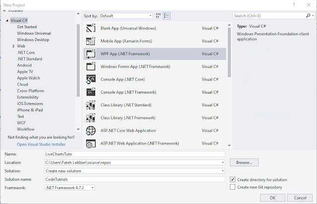 Live charts offers a pack of all sorts of awesome charts that one would find very useful ! We are going to choose one of them, and let’s go for classic one ! a Basic Column Chart :1 – First we need to create a WPF project on Visual Studio ( I am using VS2017) :